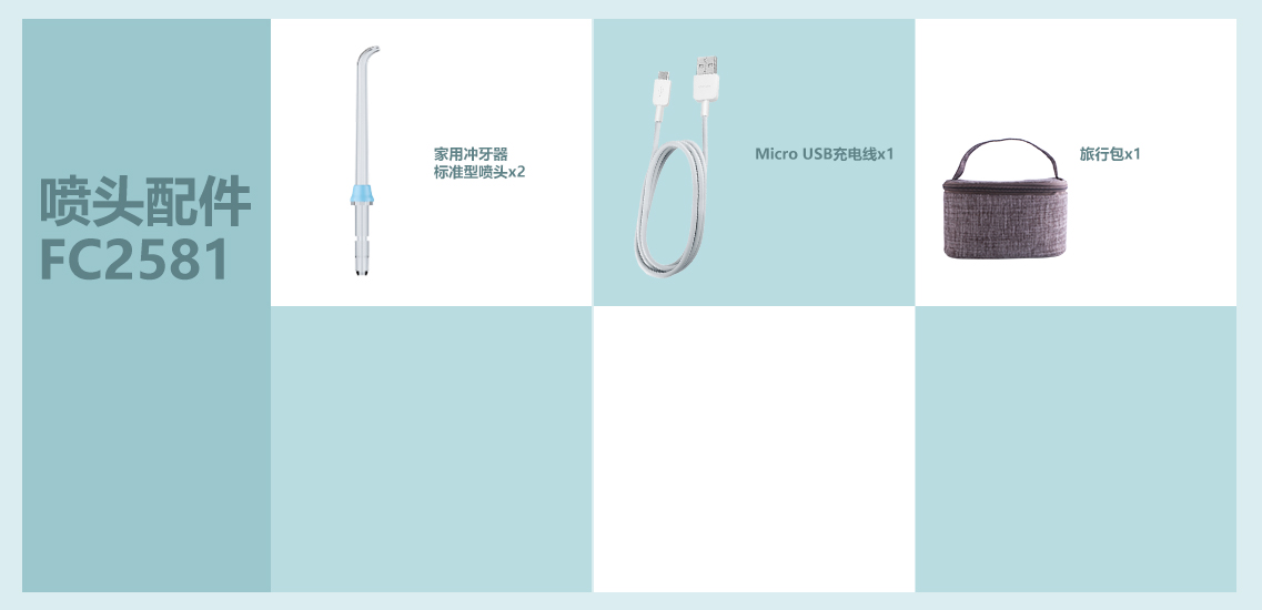 产品组成:主机/水箱/标准喷头x2/Micro USB充电线x1/旅行包x1